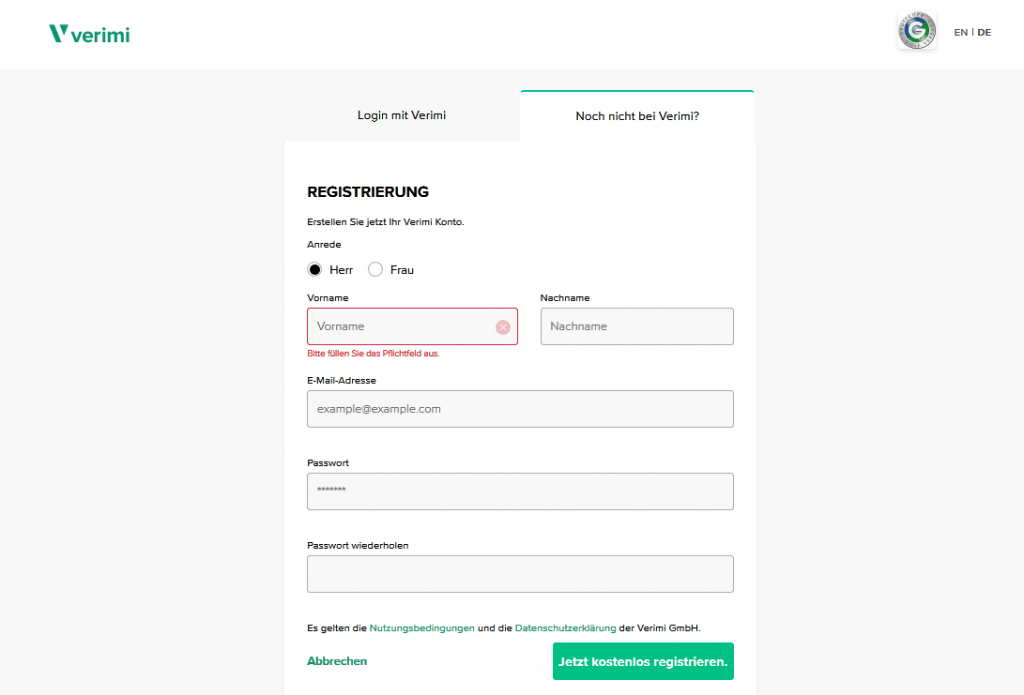 - Falls Sie noch nicht bei Verimi registriert sind wählen Sie bitte „Noch nicht bei Verimi“ und geben Ihre Daten ein.