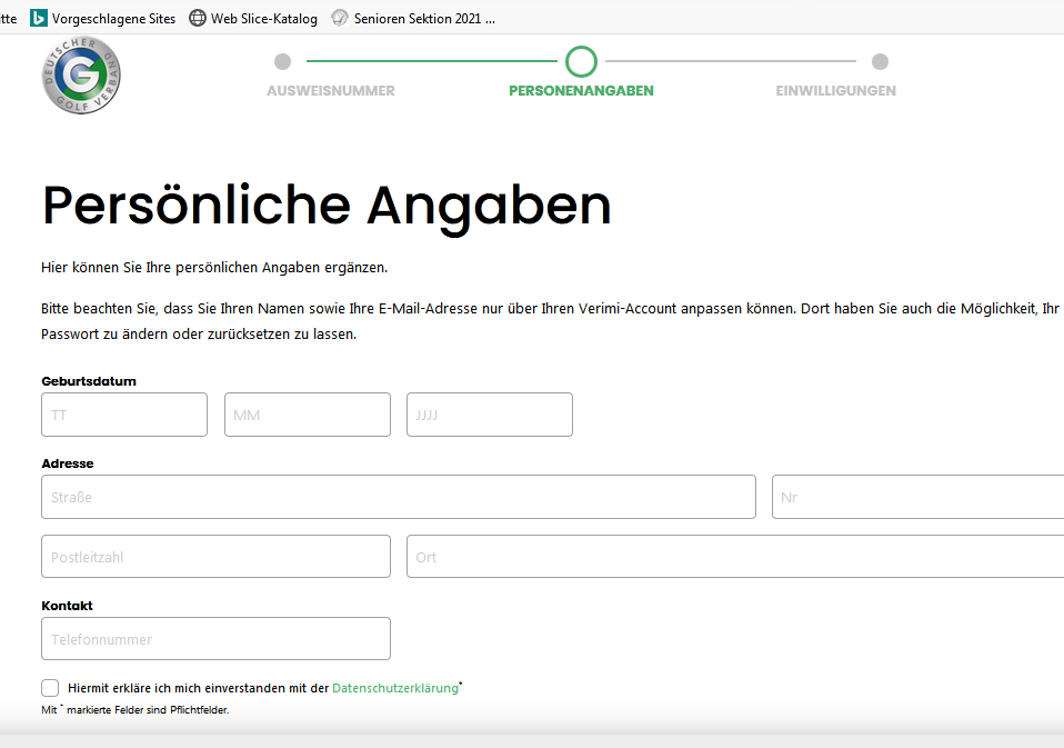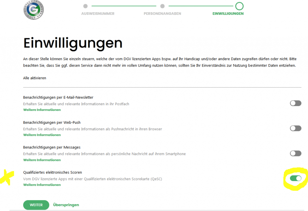 - Um alle Funktionen freizuschalten wählen Sie die bei den Einwilligungen DGV und QeSC (elektronische Scorekarte) aus.
