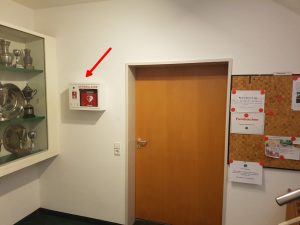 Am Ausgang zur Caddyhalle im UG ist ein Defibrillator für Notfälle installiert.