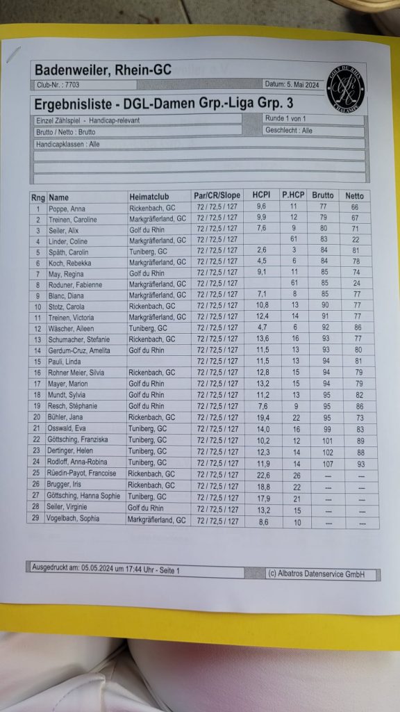 Die Teamleistung war super. Der Tagessieg ging an den GC Markgräflerland mit 56 Schläge über Paar. Auf Rang 2 folgte mit 87 Schläge über Paar Badenweiler, dicht gefolgt auf Rang 3 mit nur einem Schlag Rückstand, Rickenbach. Rang 4 ging an Tuniberg.