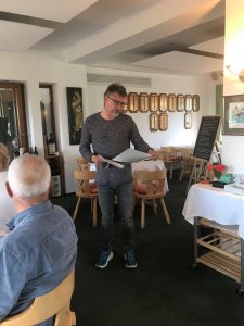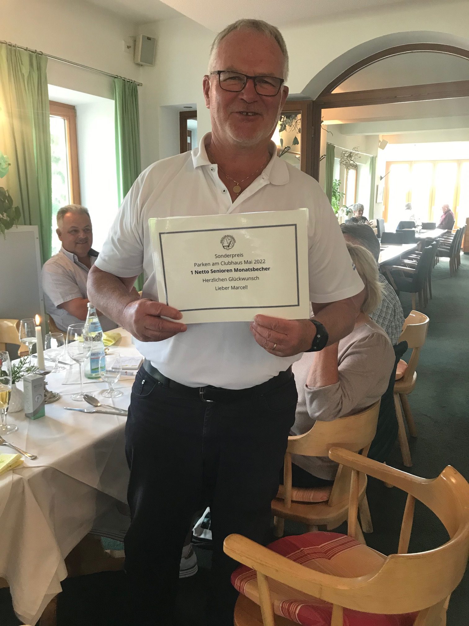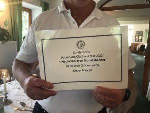 Der Wetterbericht für den 1. Monatsbecher versprach nichts Gutes. Als ich zu Hause weg fuhr regnete es in Strömen. Den Diskussionen zum Trotz klarte es auf und dem Start stand nichts mehr im Wege. Alle 25 Spieler*innen hatten mehrheitlich trockenes zum Teil sonniges Wetter, die den zwischenzeitlichen Graupelschauer vergessen liessen. In für uns Senioren zügigem Tempo erreichten wir in unter vier Stunden das Clubhaus. Das Gastroteam konnte gegen 17:00 Uhr mit dem Essen starten. Nach der ausgezeichneten Spargelsuppe konnten wir mit dem Rangverlesen beginnen. Die Preise (Blumenstrauß und Bälle) wurden vom Geburtstagskind Werner Graber gestiftet und von Eveline Graber übergeben. Der beste Spieler war Marcel Weiss der beide Wertungen für sich entscheiden konnte. Als Überraschung überreichte unser Manager Gary Oortwyn dem Sieger ein besonderes Geschenk. Marcel darf den ganzen Mai 2022 den Parkplatz von Gary benutzen – was für eine gute und schöne Geste!