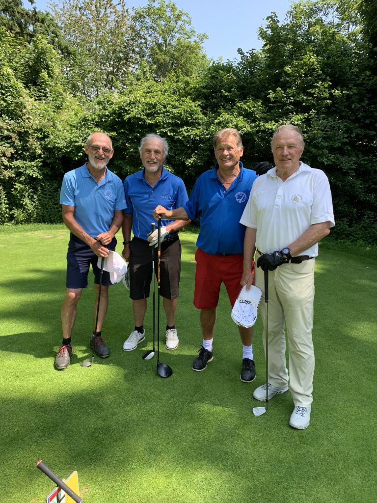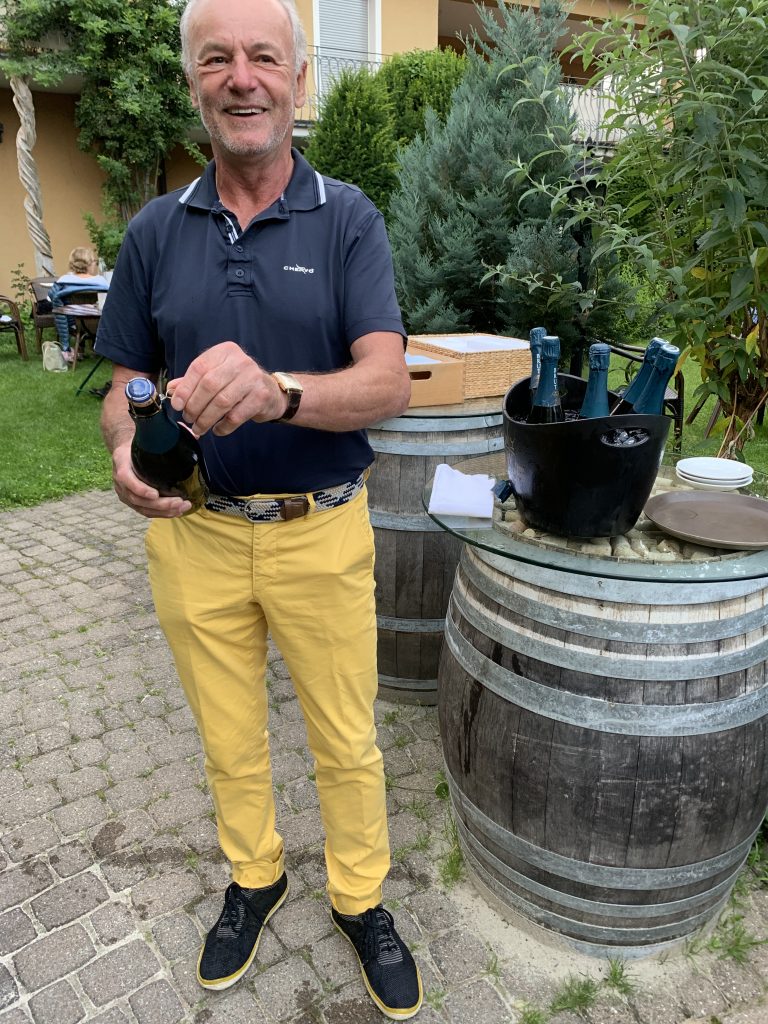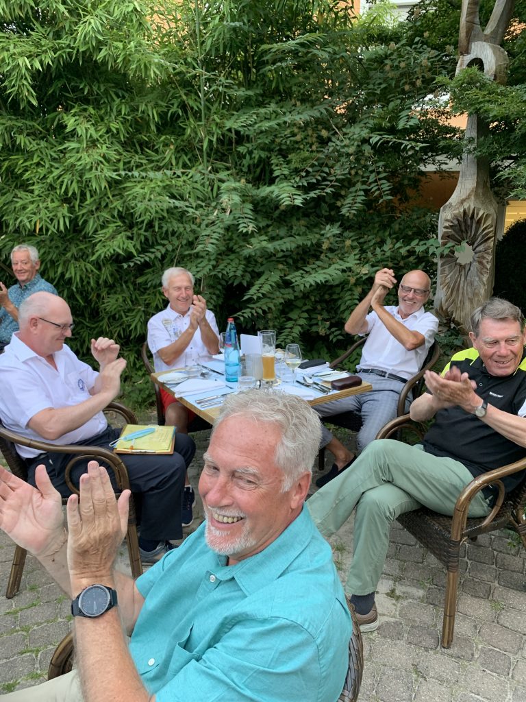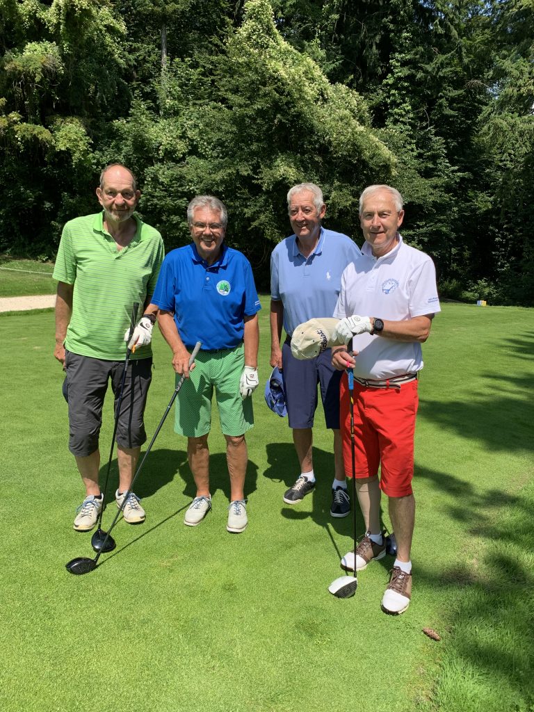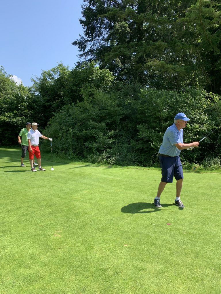 Die Anreise nach Donaueschingen war ebenfalls noch von den Unwettern geprägt. Die Hauptverbindungsstraße war gesperrt, was den Senioren gestattete, ungewollt unbekannte Regionen und enge Straßen wie das Wuttachtal oder den Siblinger Randen kennen zu lernen. Die relativ späten Startzeiten, schwülwarmes Wetter und der anspruchsvolle Eastcourse verhinderten in der Folge leider Topresultate. So war manch einer am Folgetag über die Mail von mygolf mit den neuen Handicaps „not amused“ (der Schreibende inbegriffen). Die Glanzpunkte des ersten Tages setzten Peter Schmutz mit 34 Netto- und Uli Gallmann mit 17 Bruttopunkten. Letzterer hatte dieses Resultat insbesondere seinem Hole-in-One zu verdanken. Die Senioren ihrerseits verdankten diesen Superschuss am Abend mit Applaus und dem Genuss des von Uli gespendeten Schaumweins.