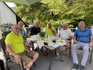 Die Vorgabe für das 5. und zweitletzte Ligaspiel von Captain Büche war zwar verwegen aber klar: Er forderte von seinen Mannen eine Platzierung vor dem Tabellenführer Drei Thermen, damit ein Vorstoss an die Tabellenspitze möglich würde. Und seine Mannschaft lieferte ab. Zwar nur um einen Schlag besser als die Konkurrenten aus Bellingen (Platz 3), doch mit dem wichtigen 2. Platz hinter den Gastgebern Gröbernhof liegen die Rickenbacher Senioren mit total 24 Punkten ex-aequo mit Drei Thermen an der Tabellenspitze. Der grosse Showdown erfolgt damit am 5. September im Heimspiel in Rickenbach. Wir dürfen gespannt sein, ob die Mannschaft erneut mit einer grossartigen Mannschaftsleistung aufwarten kann, denn die Cracks von Drei Thermen haben angekündigt, mit der bestmöglichen Mannschaft antreten zu wollen. Es sind der gute Teamgeist und die kollegiale Unterstützung auf und neben dem Platz, welche das Rickenbacher Seniorenteam diese Saison so stark machen. Drücken wir unserem Team deshalb beide Daumen, damit alle gesund und mental stark die Entscheidung Anfang September zu ihren Gunsten herbeiführen können.