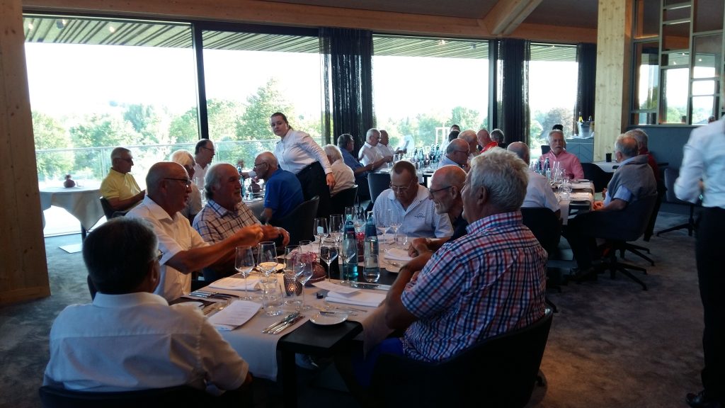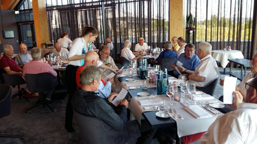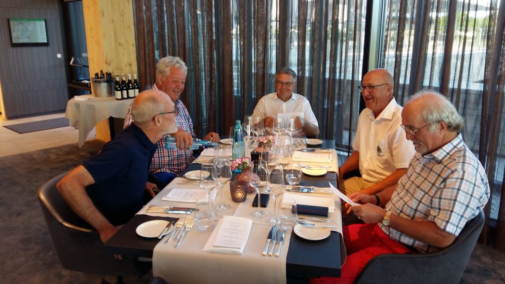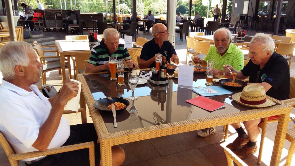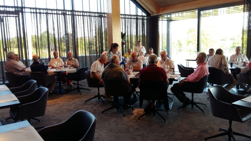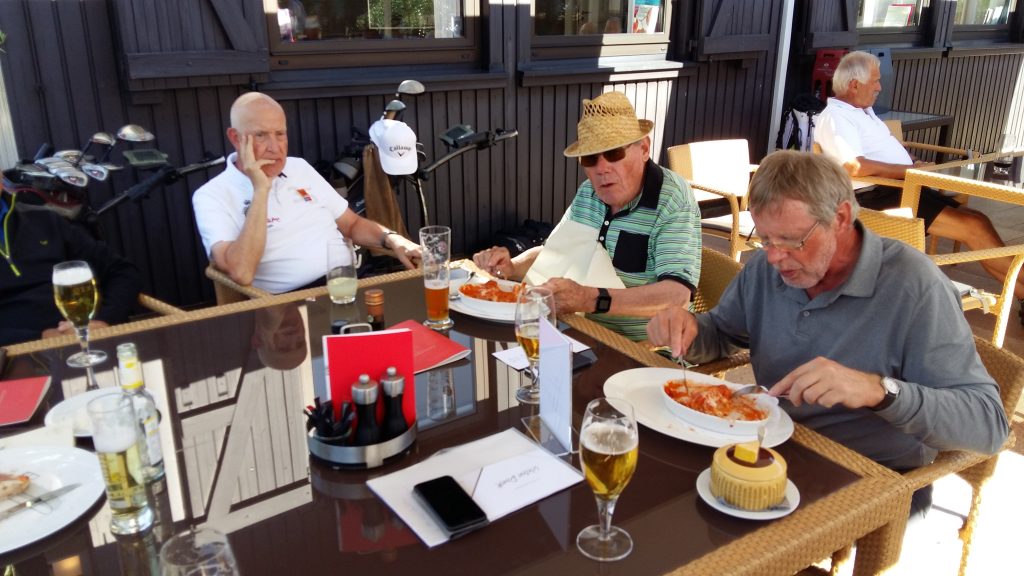 Nach der Anreise am Dienstag gabs erst mal Kaffee mit Croissants. Als Aufwärmrunde diente ab 11 Uhr der East-Course. Die hervorragenden Platzverhältnisse ließen manch einen zum beherzten Spiel hinreißen. Übermut wurde nicht selten mit dem sehr hartnäckigen Rough bestraft. Nach der Spielrunde und dem Check-in im Hotel blieb Zeit für die Nutzung des Spa Bereichs. Mit großer Disziplin wurde der Apéro-Termin wahrgenommen und anschließend das vorzügliche Nachtessen genossen. In gemütlicher Runde tauschten sich die Golfer mit ihren Platzerfahrungen und so vielem mehr aus. Gegen Mitternacht verzogen sich die ersten Richtung Bettstatt, während die Hartgesottenen nicht auf einen scharfen Schieber bis spät nach Mitternacht verzichten mochten. Zu erfahren war, dass der üppig geflossene Rotwein für die Schlafstörungen und den unerklärlichen morgendlichen Kopfdruck verantwortlich gemacht wurde. Die große Zeitspanne für das Frühstück kam manchem so sehr entgegen. Der Schlemmerei wurde ausgiebig gefrönt. Um 11 Uhr galt es dann ernst auf dem Old-Course. Beste Platzbedingungen beflügelten die ambitionierten Golfspieler. Wie so oft wurde männiglich von unsäglichem Pech verfolgt. Die Analyse der Schläge und der Befall von Widrigkeiten beim eigenen Spiel konnten beim kühlen Bier auf der gedeckten Gartenterrasse ausgiebig besprochen werden. Bei den meisten wäre wieder einmal viel mehr drin gelegen, hätte und wäre …. J!