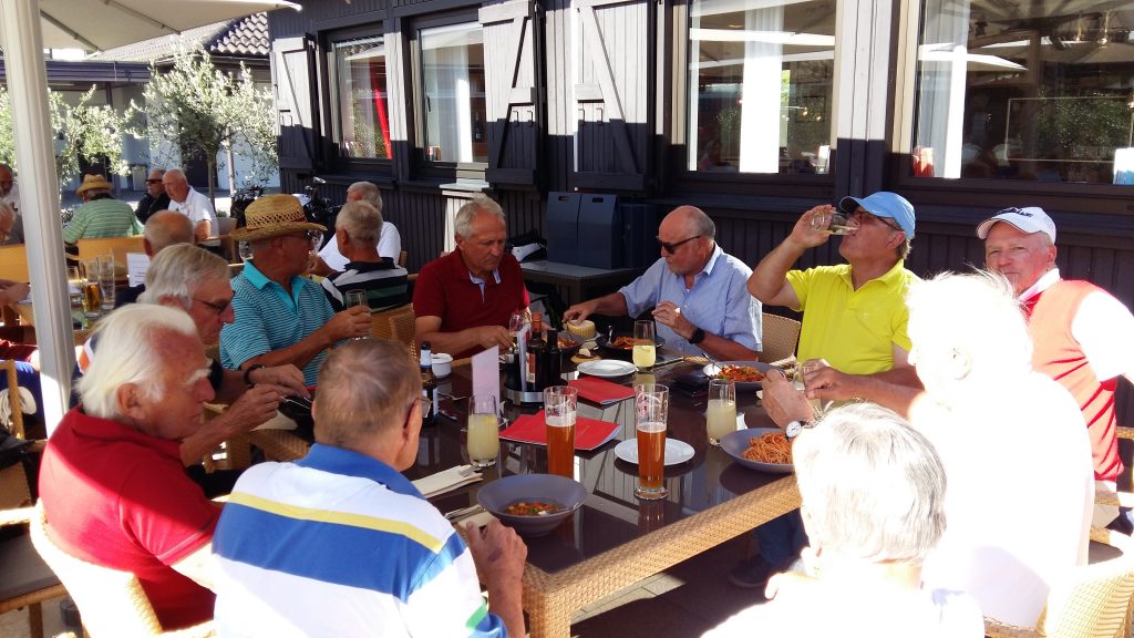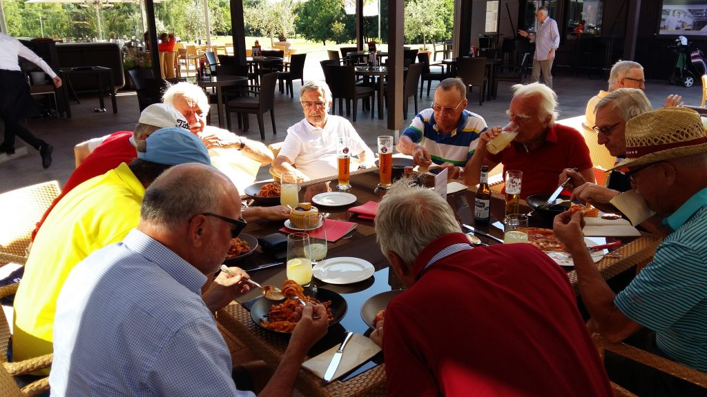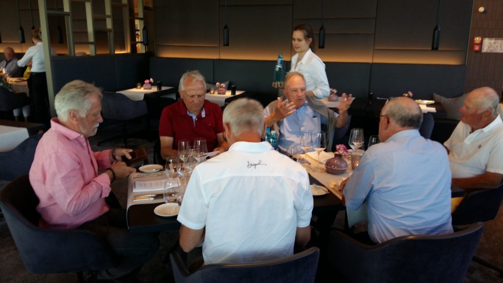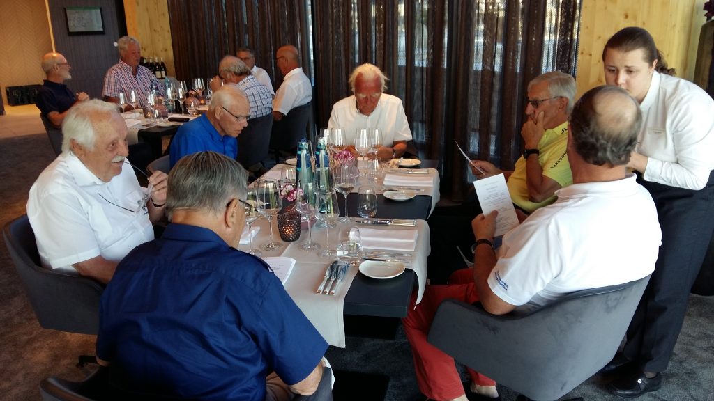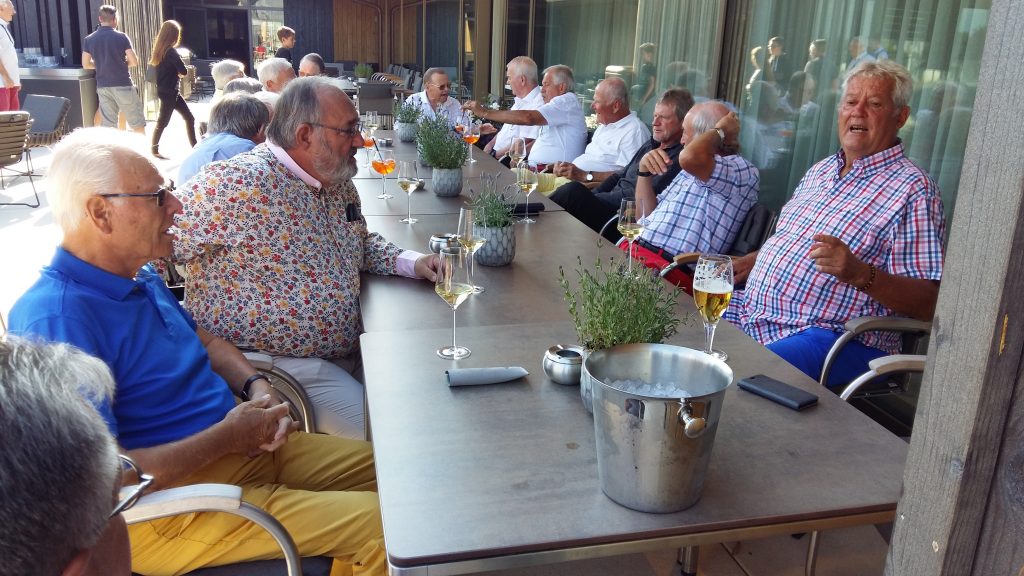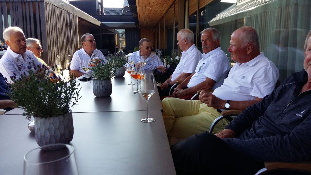 Nach der Anreise am Dienstag gabs erst mal Kaffee mit Croissants. Als Aufwärmrunde diente ab 11 Uhr der East-Course. Die hervorragenden Platzverhältnisse ließen manch einen zum beherzten Spiel hinreißen. Übermut wurde nicht selten mit dem sehr hartnäckigen Rough bestraft. Nach der Spielrunde und dem Check-in im Hotel blieb Zeit für die Nutzung des Spa Bereichs. Mit großer Disziplin wurde der Apéro-Termin wahrgenommen und anschließend das vorzügliche Nachtessen genossen. In gemütlicher Runde tauschten sich die Golfer mit ihren Platzerfahrungen und so vielem mehr aus. Gegen Mitternacht verzogen sich die ersten Richtung Bettstatt, während die Hartgesottenen nicht auf einen scharfen Schieber bis spät nach Mitternacht verzichten mochten. Zu erfahren war, dass der üppig geflossene Rotwein für die Schlafstörungen und den unerklärlichen morgendlichen Kopfdruck verantwortlich gemacht wurde. Die große Zeitspanne für das Frühstück kam manchem so sehr entgegen. Der Schlemmerei wurde ausgiebig gefrönt. Um 11 Uhr galt es dann ernst auf dem Old-Course. Beste Platzbedingungen beflügelten die ambitionierten Golfspieler. Wie so oft wurde männiglich von unsäglichem Pech verfolgt. Die Analyse der Schläge und der Befall von Widrigkeiten beim eigenen Spiel konnten beim kühlen Bier auf der gedeckten Gartenterrasse ausgiebig besprochen werden. Bei den meisten wäre wieder einmal viel mehr drin gelegen, hätte und wäre …. J!