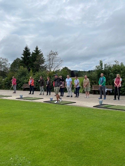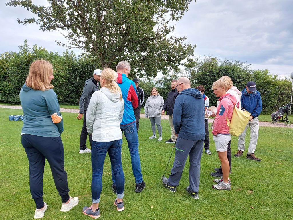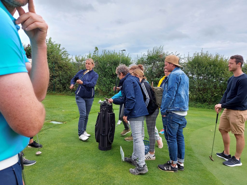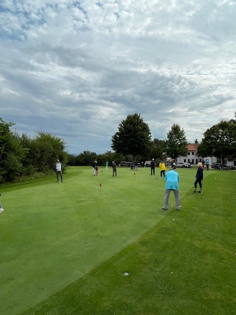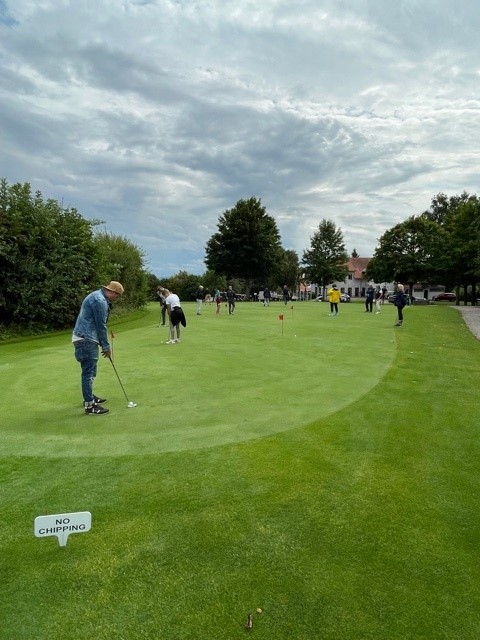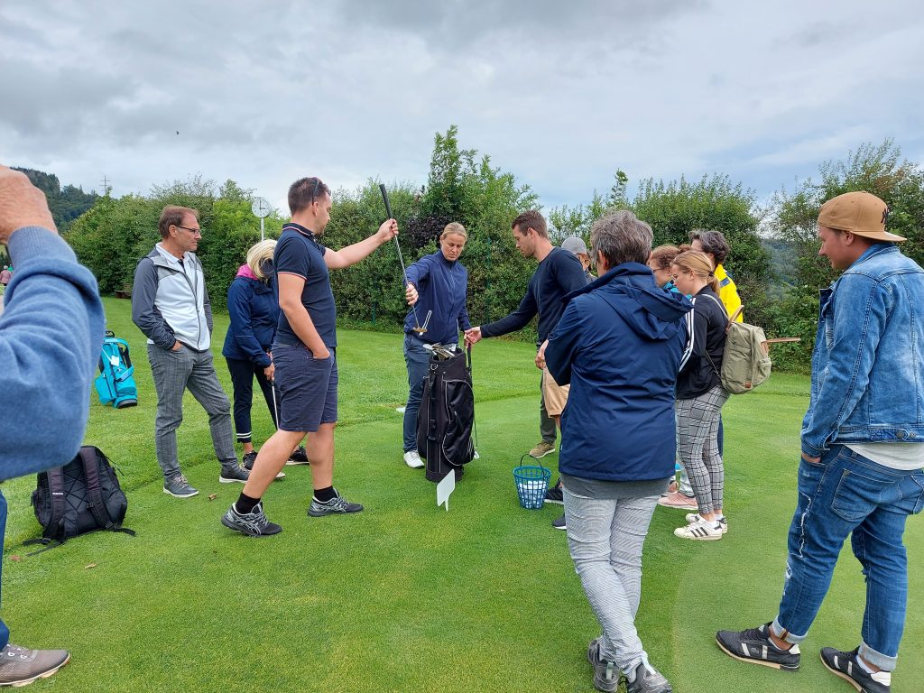Nach einstündiger Einführung in den Golfschwung durch die Pros Achim und Sebby sowie Assistentin Anna, zückte Präsident Roland Supper dann den Revolver, um den Startschuss für das Spiel auf dem Platz zu geben. Uli Delhey erwartete die Flights auf dem Platz und wie im richtigen Golferleben konnte dort jeder auch einmal den Schläger schwingen und sich von den gigantischen Entfernungen, die der Ball vom Abschlag bis zum Loch zurücklegen muss und vom unfassbar weichen und dichten Rasenteppich der Grüns beeindrucken lassen.