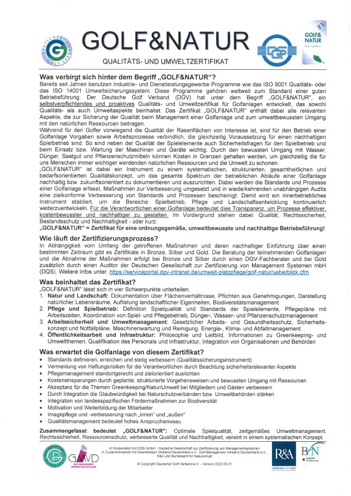 Wir beteiligen uns an dem Programm Golf&Natur des Deutschen Golfverbands. Dieses bietet im Rahmen einer mehrjährigen Planung die Chance, die pflegerischen Gegebenheiten einer Golfanlage zu erfassen und in abgestuften Schritten zu verbessern. Das aus Mitteln der Deutschen Umweltstiftung geförderte Projekt entstand in Zusammenarbeit mit dem Bundesamt für Naturschutz sowie dem Greenkeeper-Verband Deutschland und wird durch die Universität Hohenheim wissenschaftlich unterstützt.