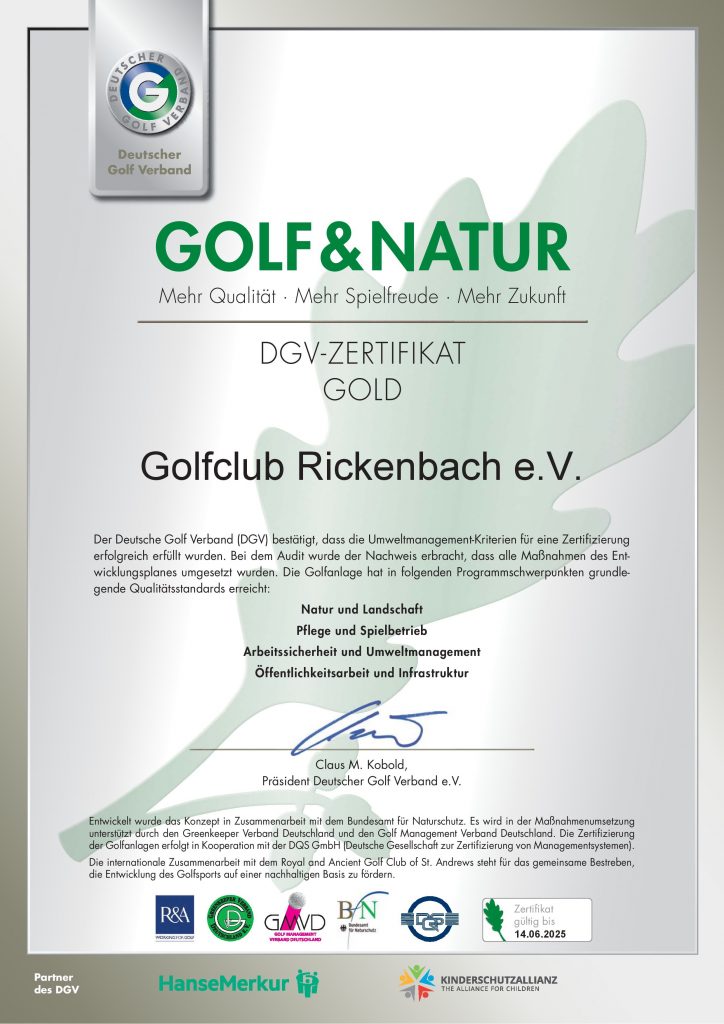 Am 13. September 2017 wurde uns das Qualitätszertifikat «Silber» von Vertreter des Deutschen Golfverbandes sowie externen Vertreter der DQS (Deutsche Gesellschaft zur Zertifizierung von Management Systeme mbH) überreicht. Bereits seit 2011 gehört der Golfclub Rickenbach zu den ausgewählten Golfclubs in Deutschland, die sich einer ordnungsgemäßen, umweltbewussten und nachhaltigen Betriebsführung im Namen der Zertifizierung GOLF&NATUR des Deutschen Golfverbandes verschrieben haben. In Baden-Württemberg ist Rickenbach der elfte Golfclub mit dem Zertifikat «Silber».