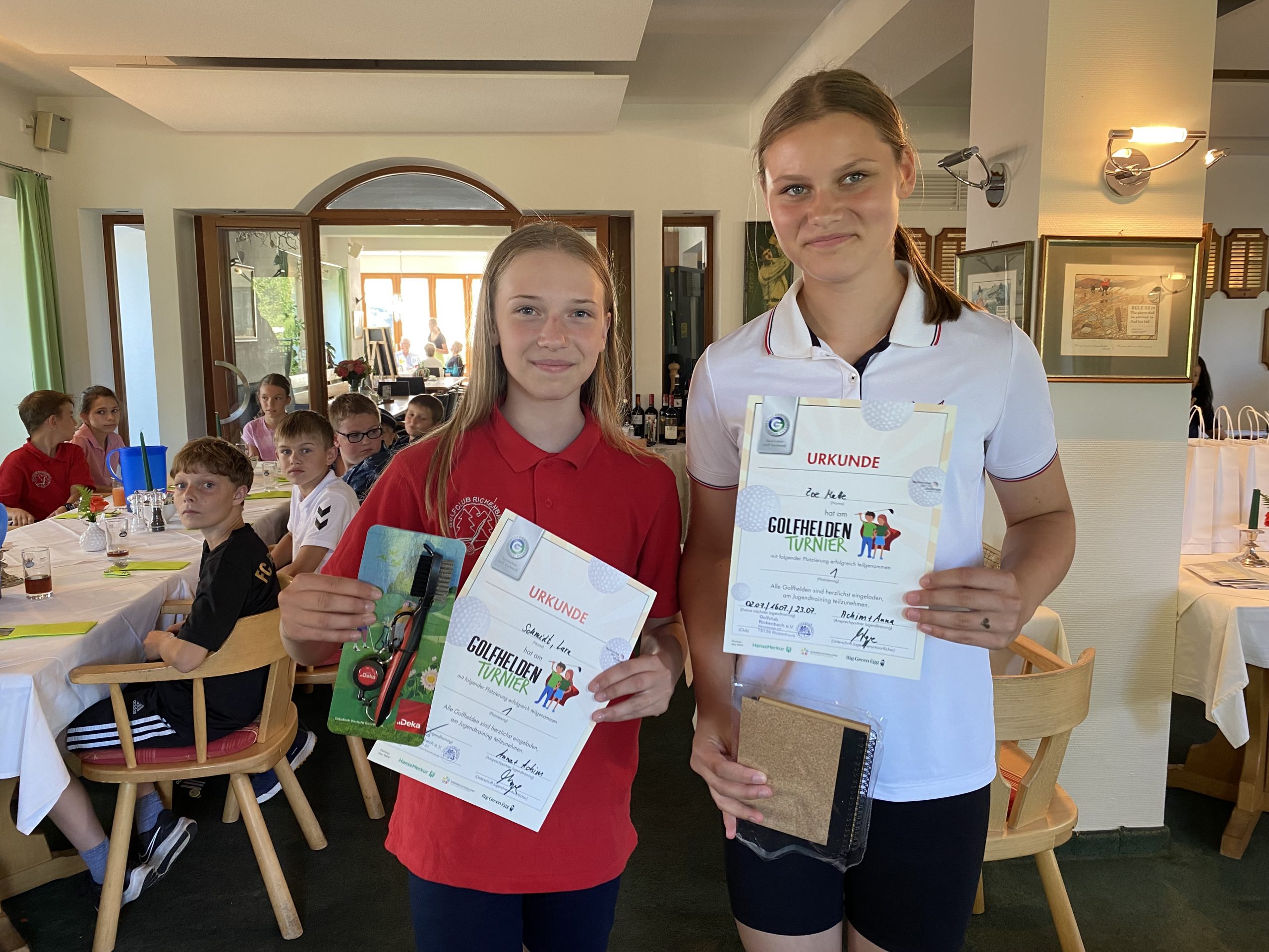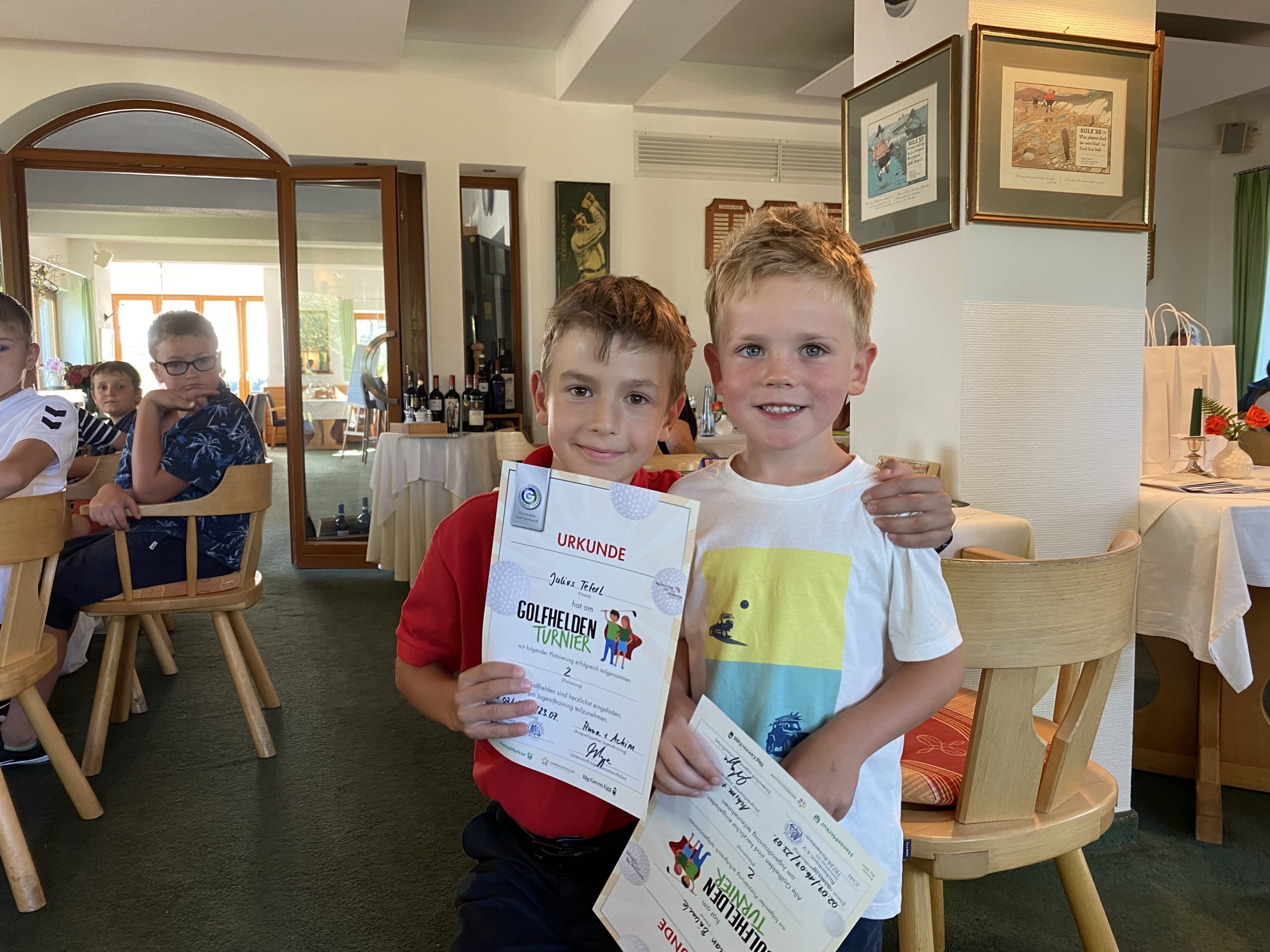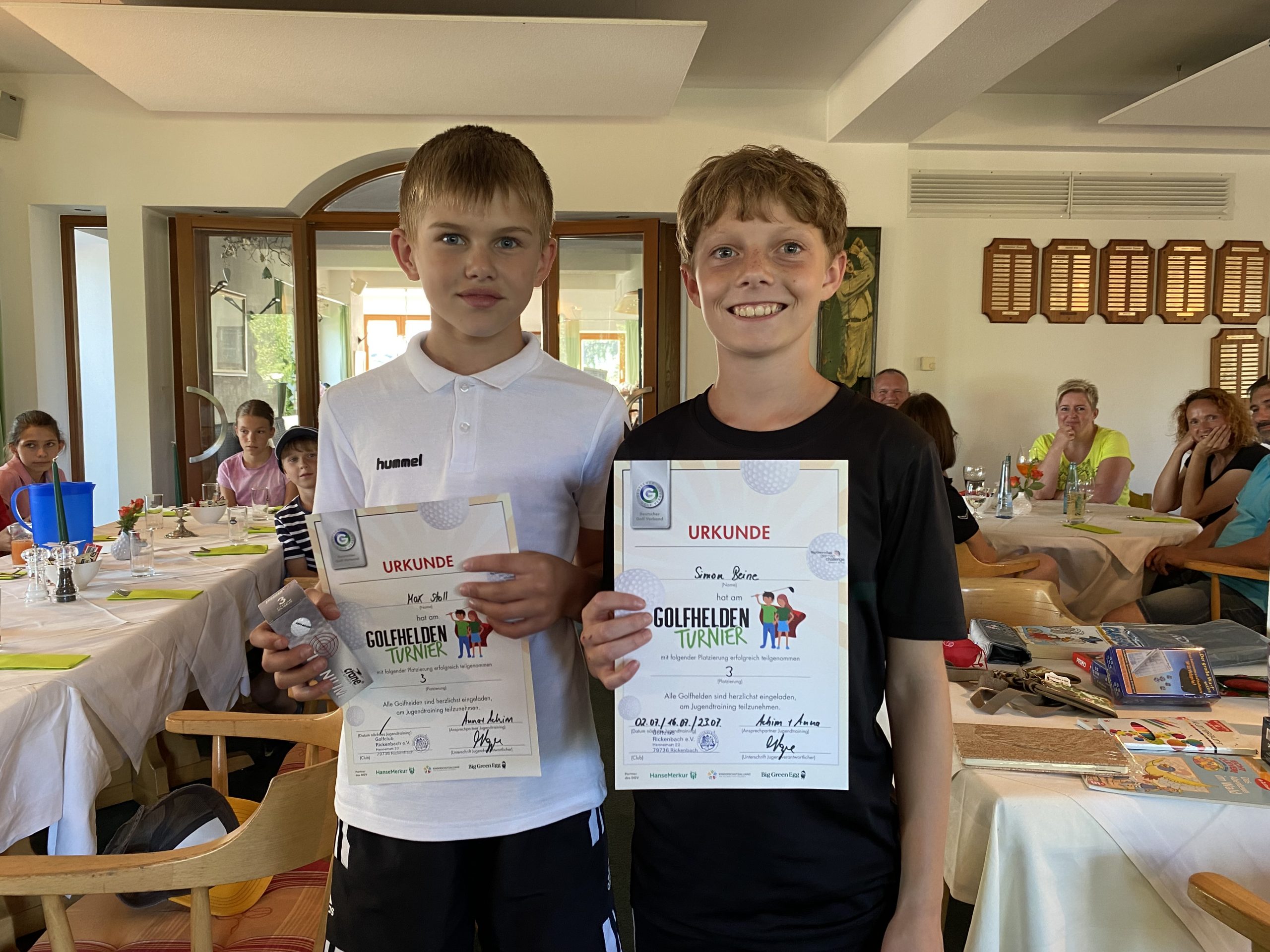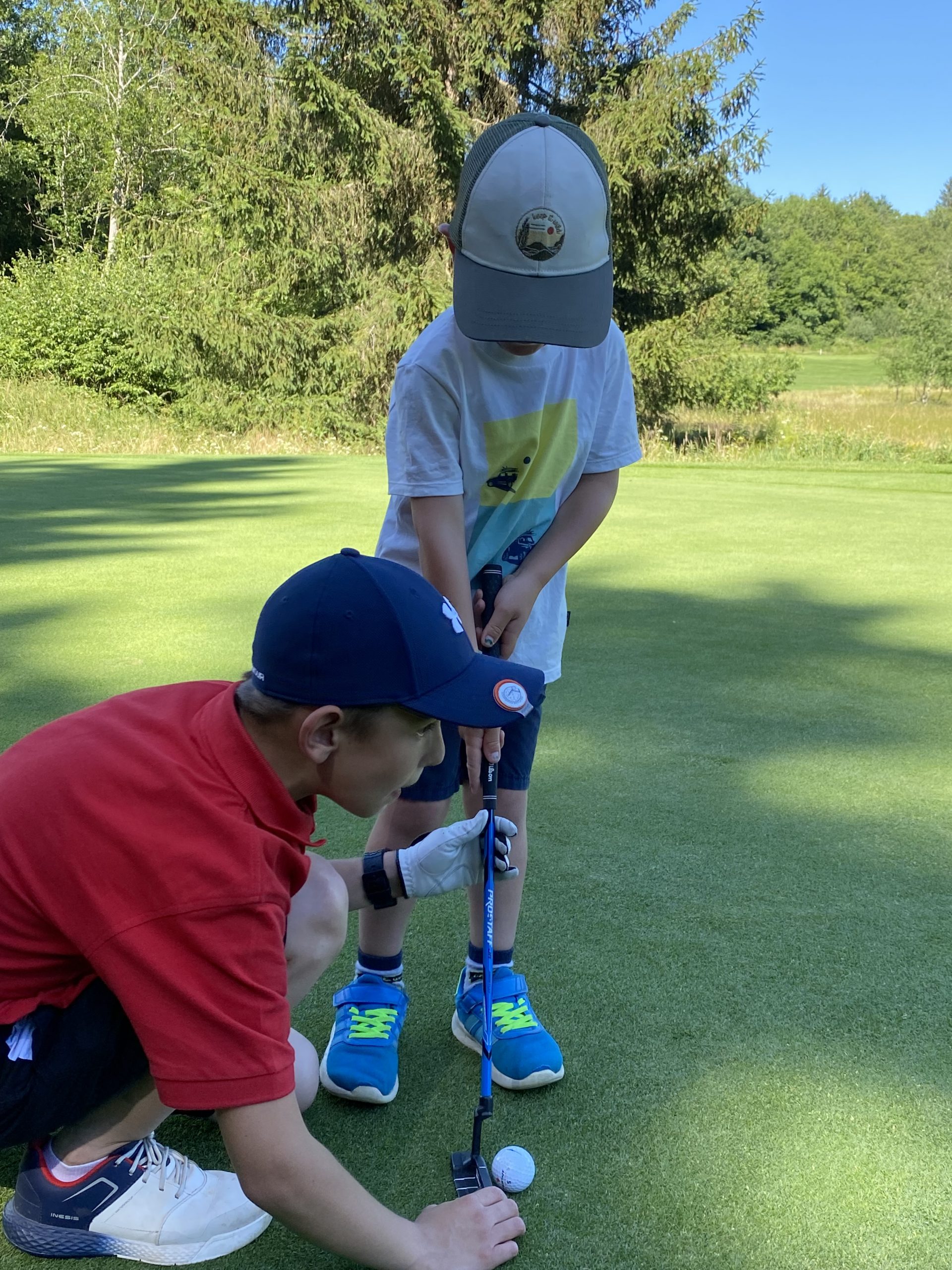 Das erste „Golfheldenturnier“, ein Nachwuchs-Projekt des Deutschen Golfverbandes, fand am 25.06.2022 zum ersten Mal im Golfclub Rickenbach statt. 20 Kinder, darunter 10 aktive Jugendspieler des GCR hatten die Möglichkeit ihre nicht golfspielenden Freunde zum gemeinsamen Golfen einzuladen. Der Nachmittag startete für alle Kinder und deren Eltern auf der Driving Range. Achim erklärte allen spielerisch, was es mit dem Golf so auf sich hat. Dann durften alle an die Schläger und die Bälle und es selbst ausprobieren. Hierbei wurden alle blutigen Anfänger von der aktiven Jugend unterstützt. Selbst die jüngsten Spieler unseres Clubs zeigten mit Geduld ihren Freunden, wie man ebenso Golf spielt. Mit großer Gespanntheit ging es nach dem Schnuppertraining dann für alle Kinder zum 4-Loch Turnier auf den Golfplatz. In Zweierteams eingeteilt machte die aktive Jugend die Schläge auf dem Fairway und die Freunde durften dann auf dem Grün sich um die Putts kümmern. Mit hochroten Backen und einem breiten Lächeln im Gesicht, trudelten die Flights nach einer Stunde wieder im Clubhaus ein. Es wurde eifrig über die Putts und Schläge diskutiert und über die eine oder andere Situation auf der Runde gelacht. Den ersten Platz konnte das Team mit Lara Schmidt und Zoe Matte belegen, den zweiten Platz holte sich Julius Tefert-Poppe mit Florian Bäumle (gerade mal 4 Jahre alt, aber geputtet wie ein Profi) und den dritten Platz belegte Max Stoll mit Simon Beine. Anschließend gab es ein gemeinsames Abendessen für alle Kinder und deren Eltern. Die Freunde unserer aktiven Jugend wurden zum nächsten Jugendtraining eingeladen. Ein super toller Tag ging langsam zu Ende…aber nur langsam, denn alle 20 Kinder gingen selbständig gemeinsam nach dem Abendessen auf die Driving Range und hatten dort noch eine Menge Spaß beim Schlagen der Bälle.