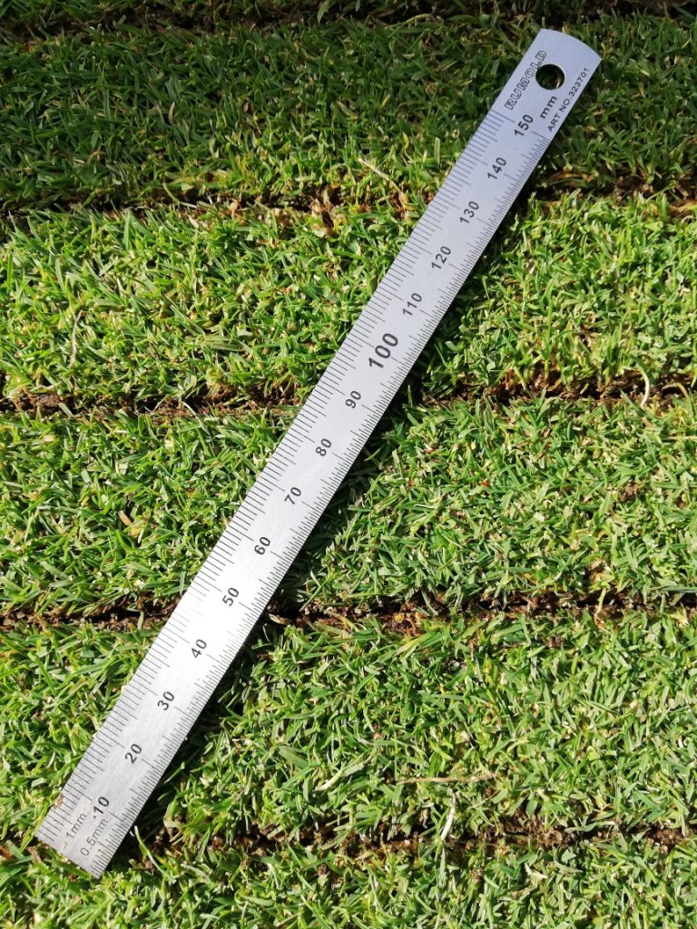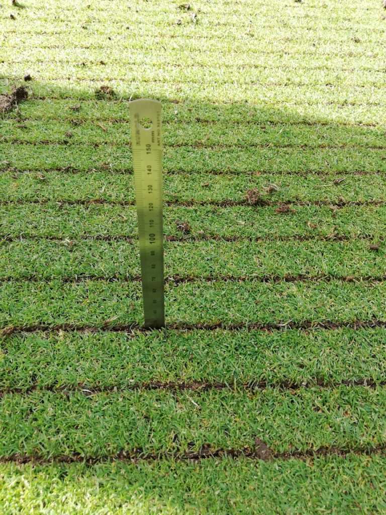Hierbei  ist unterhalb der Rasenebene die Filzbildung (heller Streifen) während der Saison erkennbar. Mit diesen Maßnahmen gibt es weniger Pilzbildung, die notwendige Luft dringt so ins tiefere Erdreich und Wasser kann in vernünftigem Maße sickern. Pfützenbildung und Schadstellen werden minimiert.