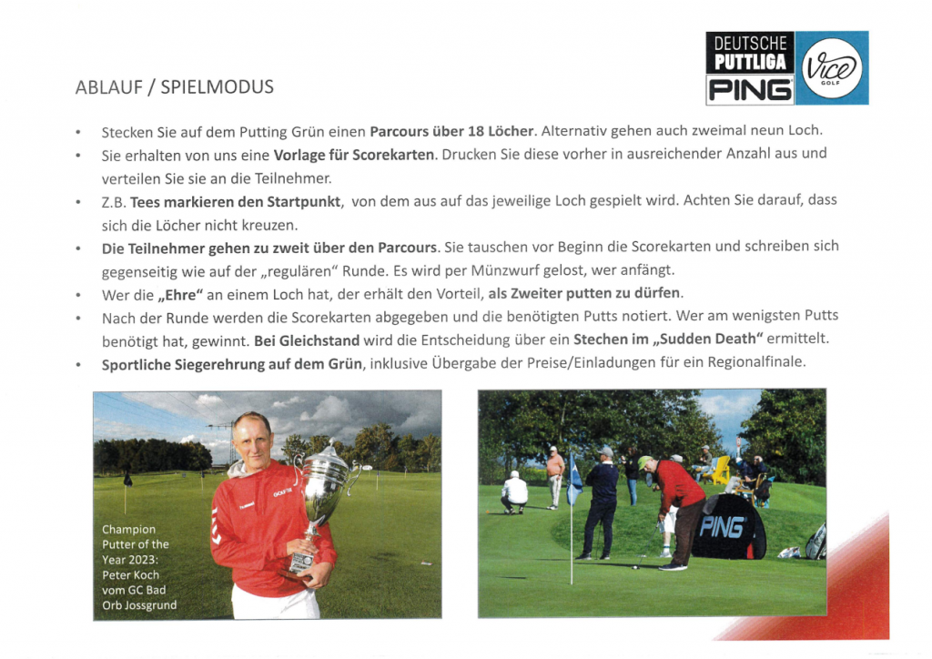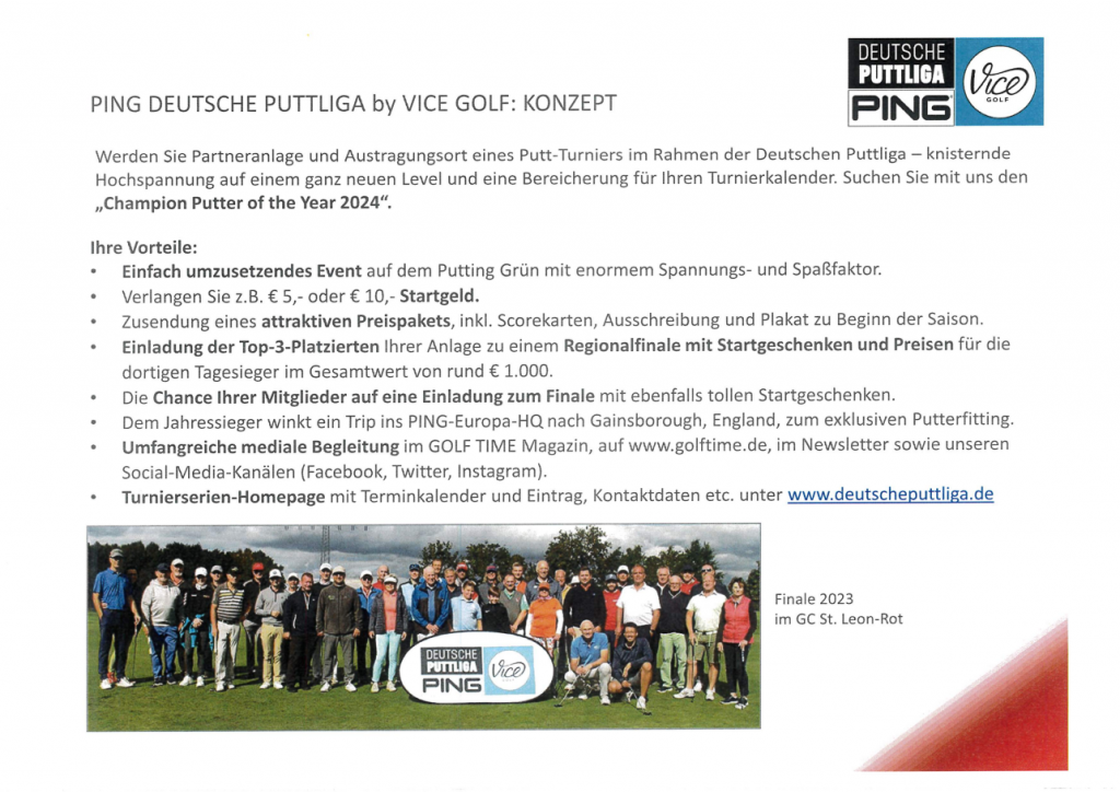 Am Samstag, den 01.06.2024 findet ein Putt-Event von PING Deutsche Putt Liga auf unserem Putting Green am Clubhaus statt. PING sucht den „Champion Putter of the year 2024“ mit tollen Preisen. Unter den Teilnehmern auf unserer Anlage erhalten die Top 3 Plazierten eine Einladung zum Regionalfinale. Startgebühr 10€ pro Teilnehmer.