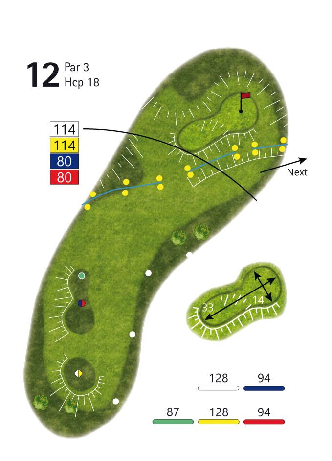 Beim Anspielen des Grüns sollte man beachten, dass vor dem Grün ein Graben verläuft, aus dem man den Ball, wenn überhaupt, nur schwer spielen kann.