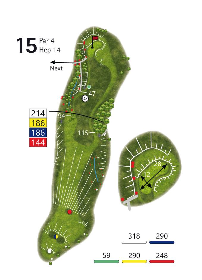 Dropping-Zone (beim Weganfang): Liegt der Ball auf dem Weg (straflos), liegt er Ball links vom Weg im seitlichen Wasserhindernis (1 Strafschlag).