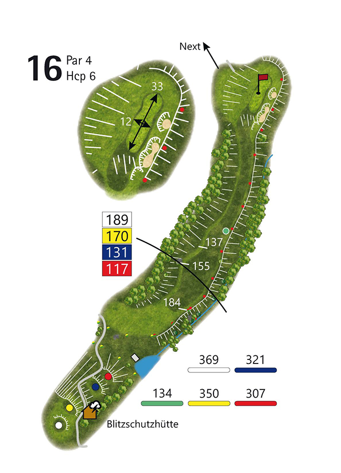 Vielleicht ist ‚vorlegen‘ aber auch hier die bessere Lösung, damit mit dem 3. Schlag das Grün angespielt werden kann. So kommen die beiden Bunker auf der rechten Grünseite weniger ins Spiel.