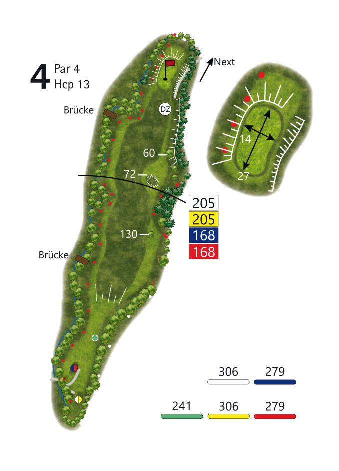 Vom Abschlag aus sollte der Drive mittig Fairway liegen. Ca. 80 m vor dem Grün befindet sich auf der rechten Seite ein Grasbunker.