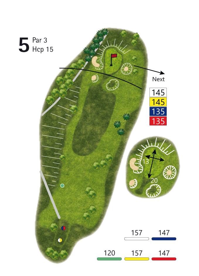 Ca. 15 m vor dem Grün befindet sich auf der linken Seite ein Bunker, auf der rechten Seite ein Grasbunker. Das Grün selbst wird auf der linken und rechten Seite von je einem weiteren Bunker geschützt.