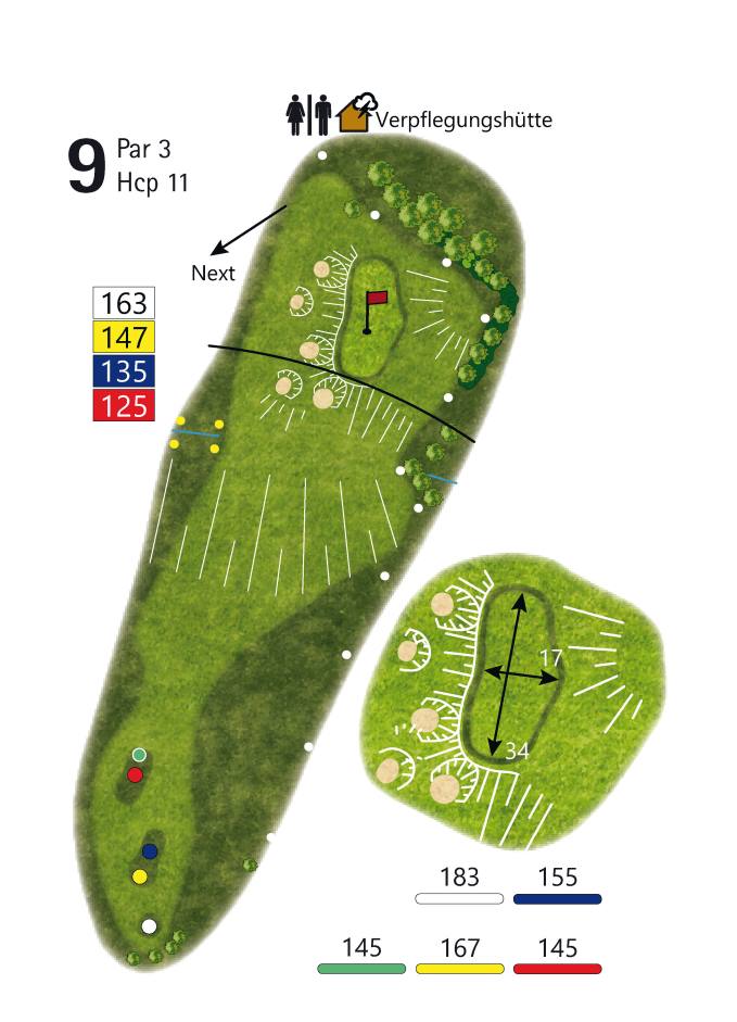 Die gesamte rechte Fairway-Seite, bis hinter dem Grün, ist „AUS“. Landet der Ball rechts unten in der Senke, verspringt er oft ins Gebüsch. Provisorischen Ball spielen!