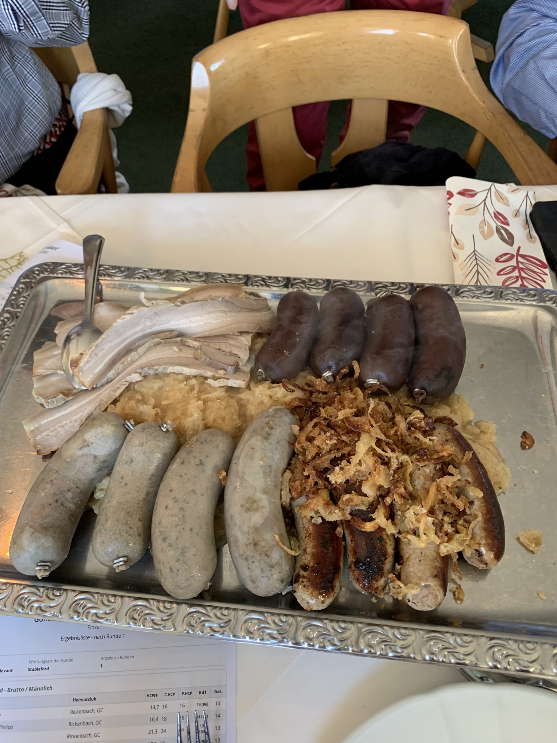 Anschliessend haben uns die Jubilare zu einer opulenten Schlachtplatte/Metzgete eingeladen, die von Kurt vortrefflich zubereitet wurde. Es hat nichts gefehlt, Blut- und Leberwurst, Bratwurst und Speck, sowie die Beilagen Sauerkraut, Kartoffelbrei und Röstzwiebeln wurden uns serviert.