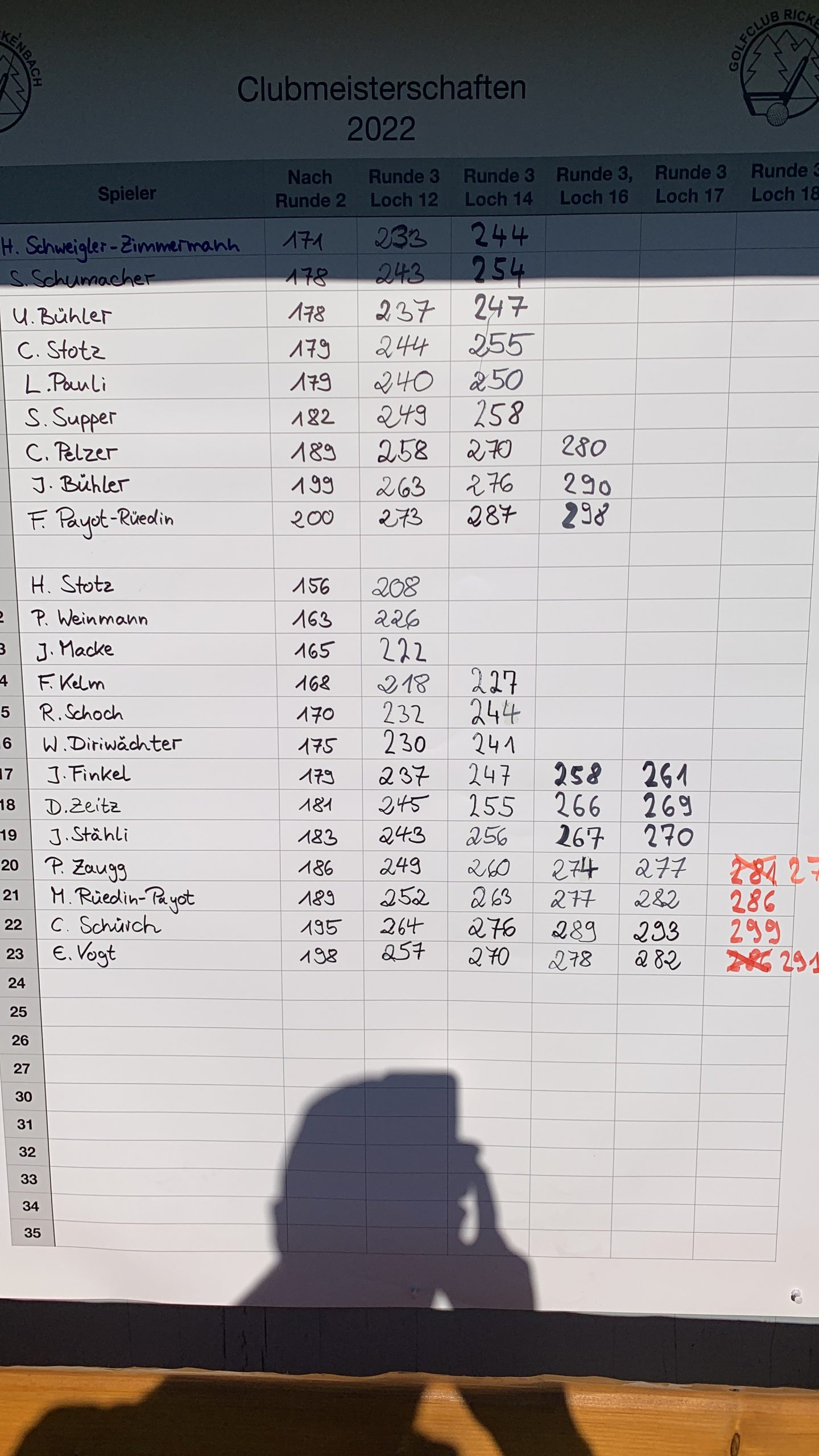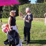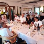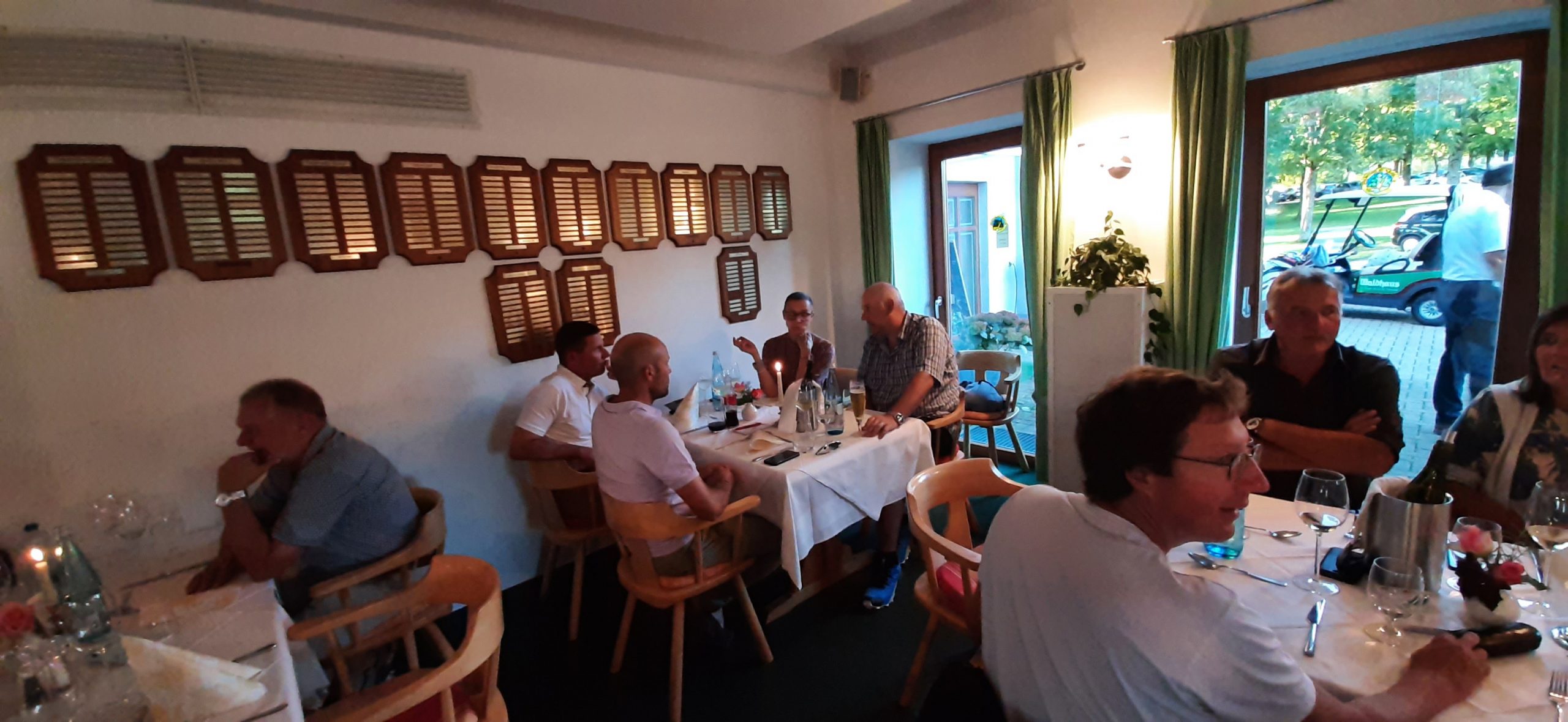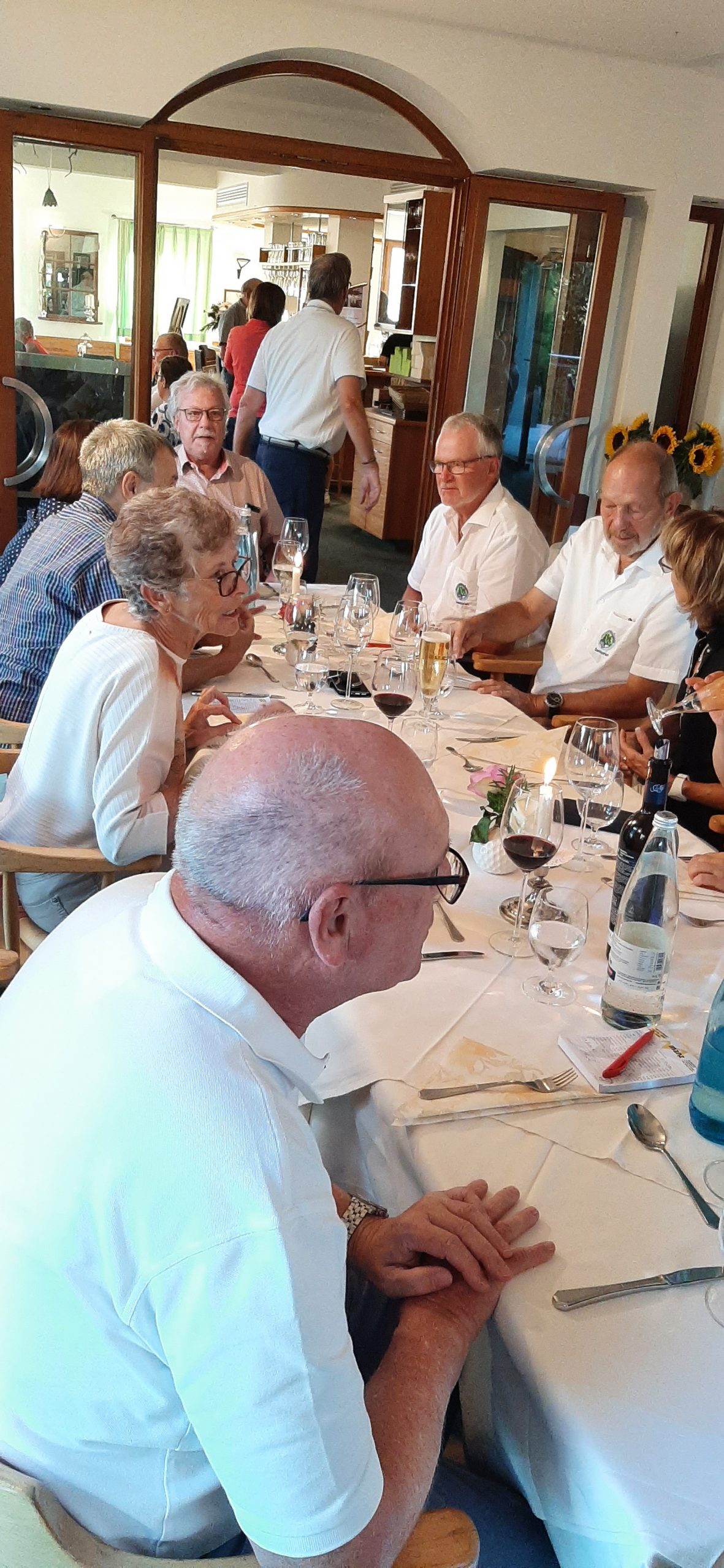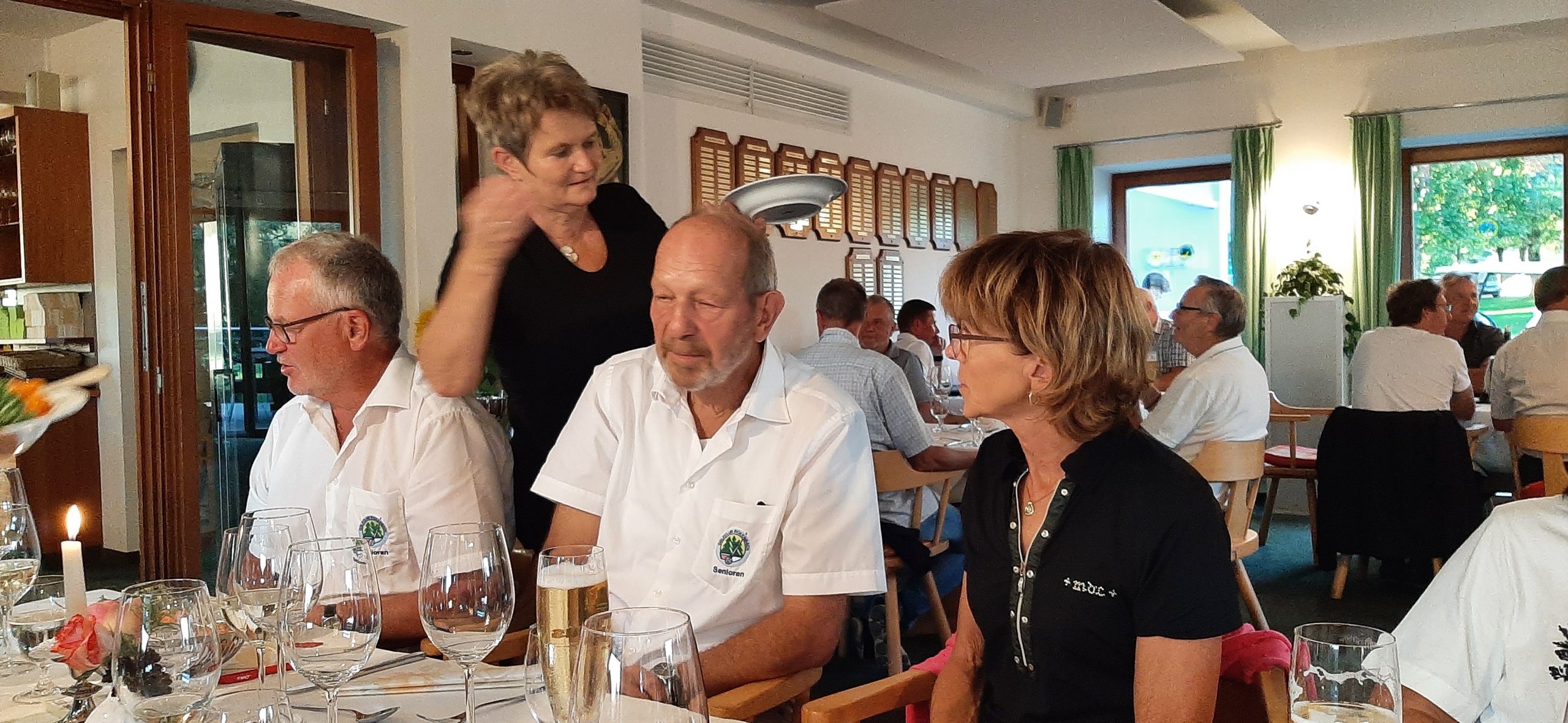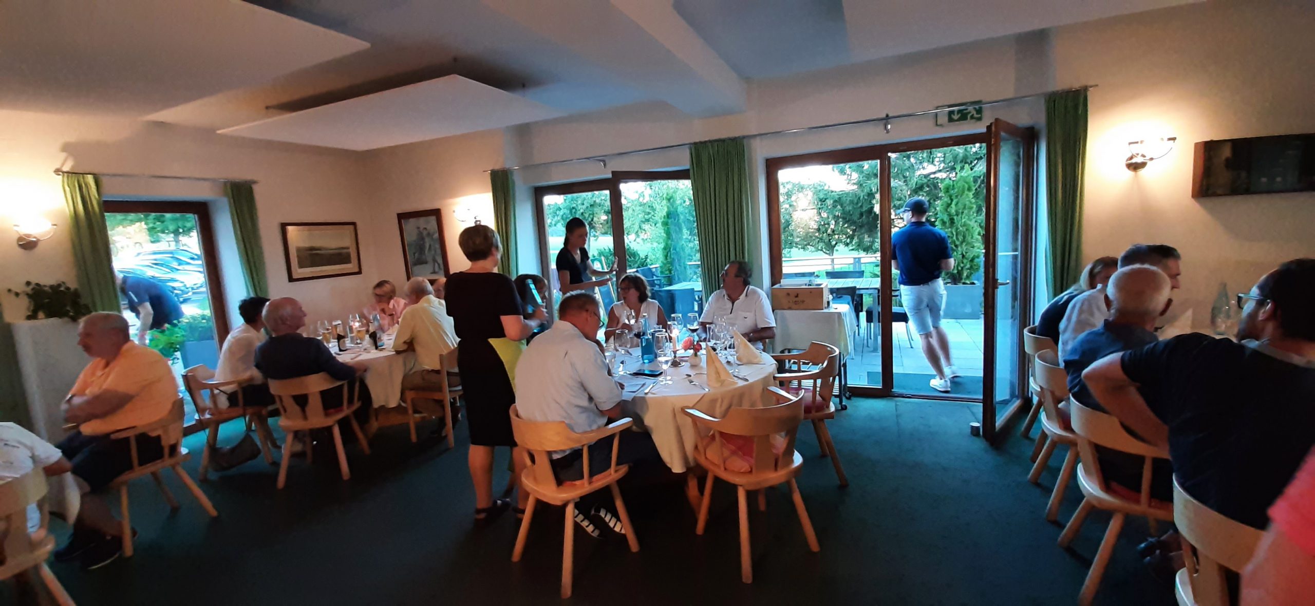 Mit Spannung erwarteten Teilnehmer und Gäste die Rückkehr der Aktiven von ihrer 3. Runde an Grün 18. Bei gekühlten Getränken bester Stimmung wurde das Live-Scoring aufmerksam verfolgt und die Schläge der Spieler wurden mit Applaus belohnt. Die Spannung begann zu knistern, als sich an Loch 17 ein Führungswechsel bei den Damen abzeichnete, der dann am Schlussloch in einem Gleichstand endete. Die beiden Favoritinnen Ursula Bühler und Helga Schweigler-Zimmermann (im Bild 4. von rechts) mussten anschliessend die Entscheidung in einem Stechen an Loch 18 herbeiführen. Beim ersten Extraloch konnte sich Helga durchsetzen und den Clubmeistertitel erringen. Heiko Stotz (2. von links) konnte seinen Titel vom Vorjahr souverän verteidigen und spielt zudem auch die beste Runde mit 75 Schlägen. Die Clubmeistertitel der Senioren errangen Gerda Kappler (3. von links) und Marcel Weiss (1. von rechts). In der neuen Kategorie „Netto“ durften Pia Canzoneri (2. von rechts) und Michael Wladarz (4. von rechts) die begehrten Pokale mit nach Hause nehmen. Die Siegerehrung in Rahmen des Championsdinner nahmen Präsident Roland Supper (3. von rechts) und Spielführer Markus Oehl (1. von links) vor.