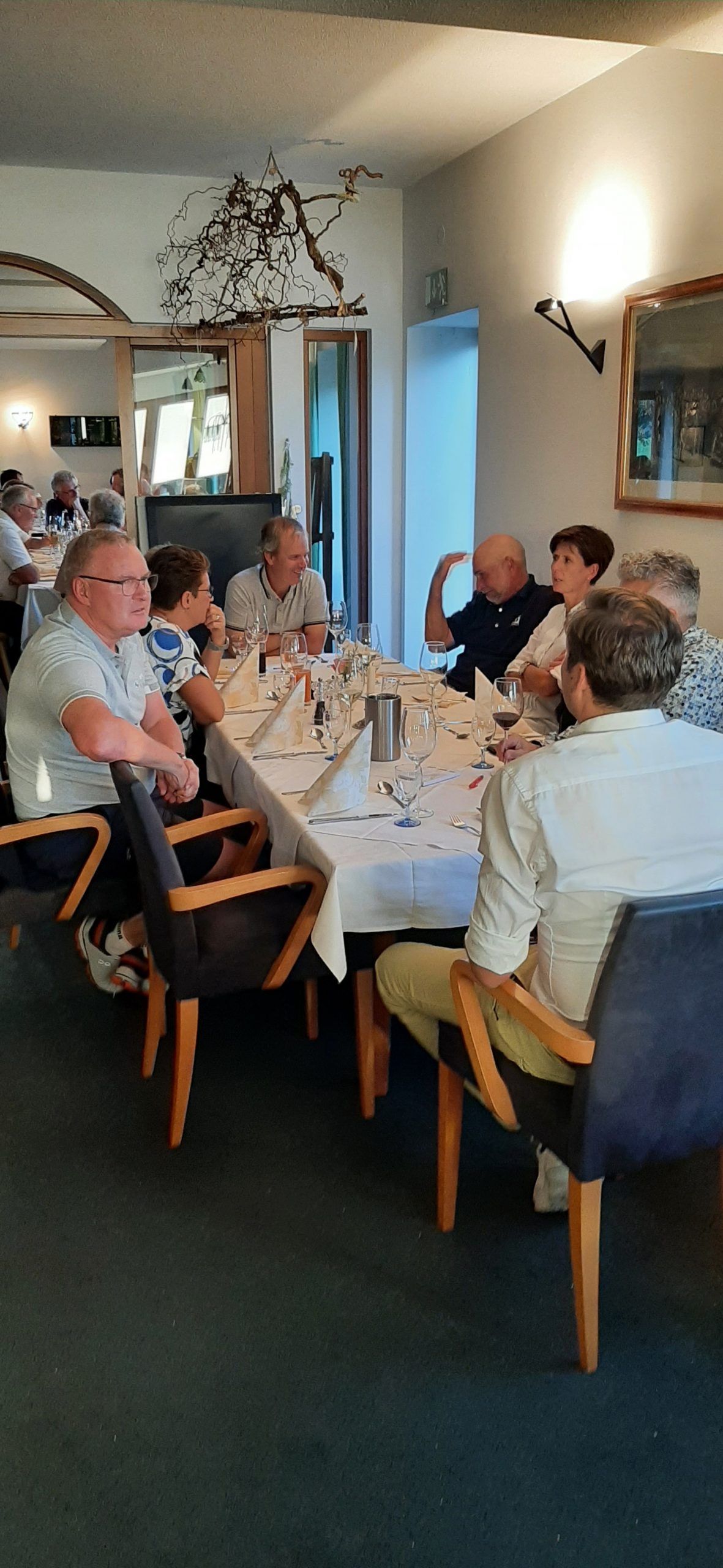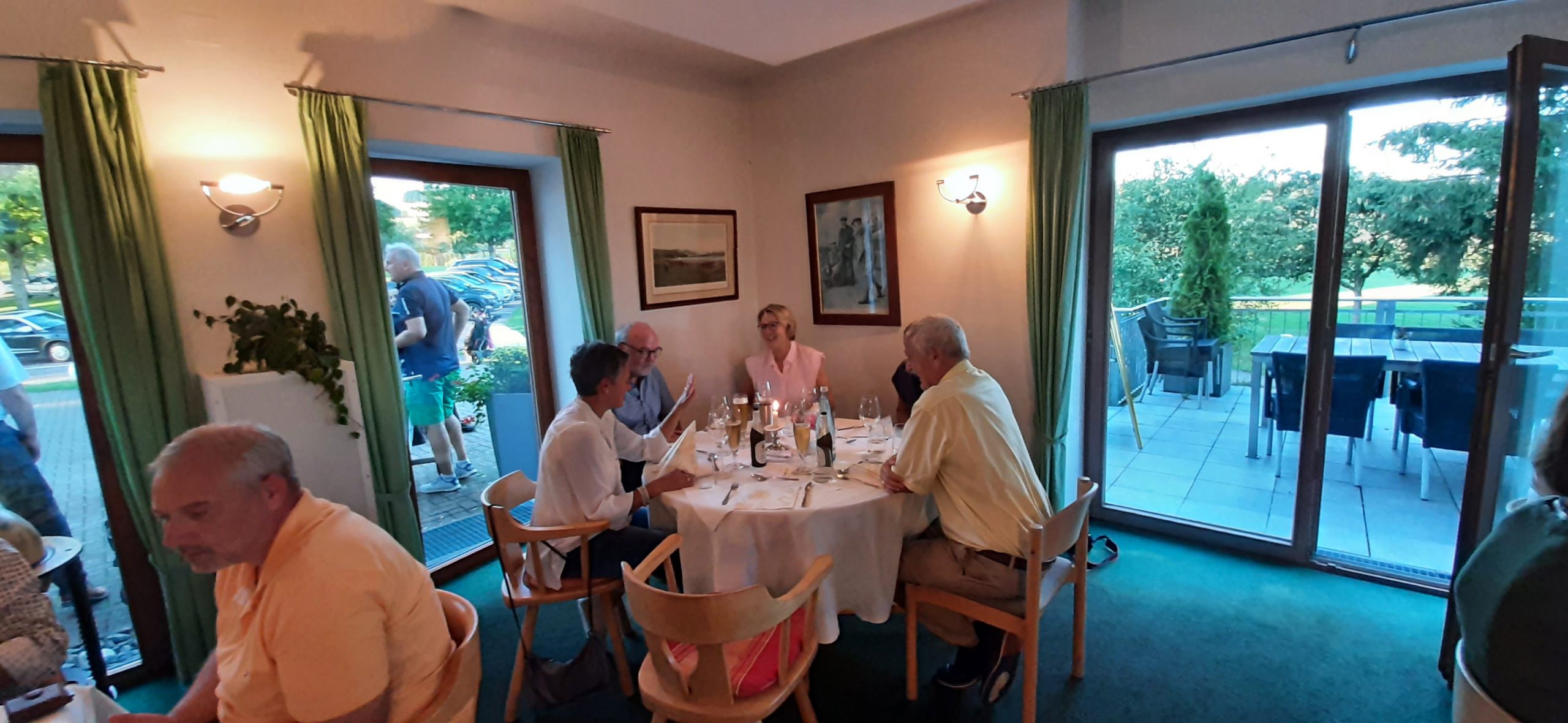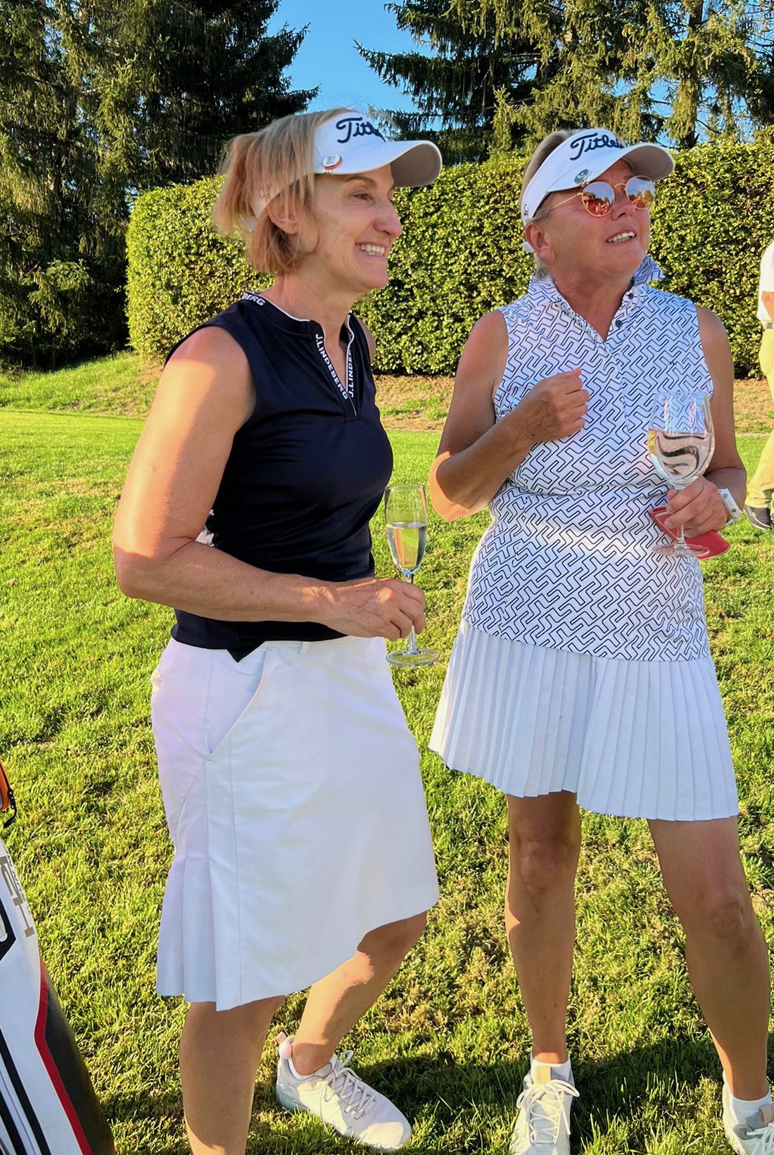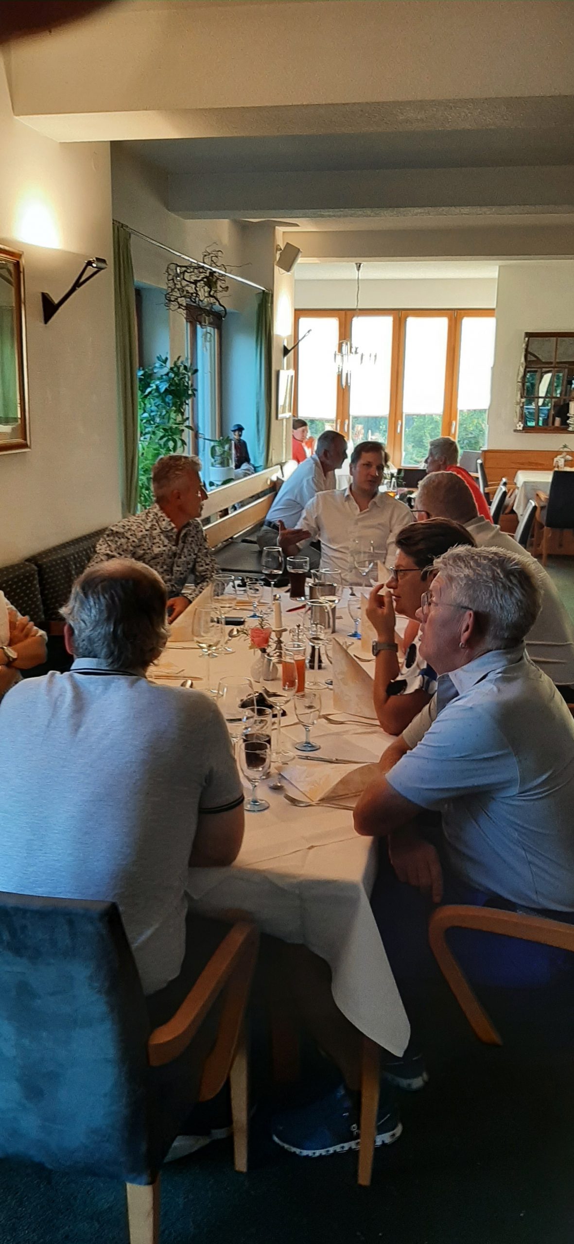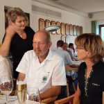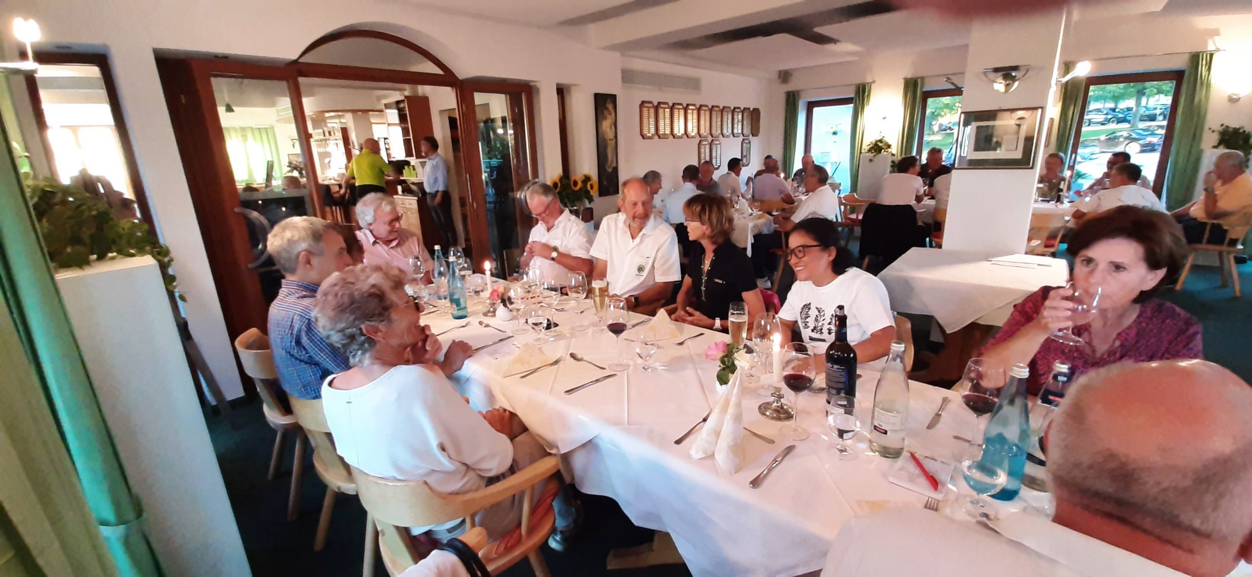 Mit Spannung erwarteten Teilnehmer und Gäste die Rückkehr der Aktiven von ihrer 3. Runde an Grün 18. Bei gekühlten Getränken bester Stimmung wurde das Live-Scoring aufmerksam verfolgt und die Schläge der Spieler wurden mit Applaus belohnt. Die Spannung begann zu knistern, als sich an Loch 17 ein Führungswechsel bei den Damen abzeichnete, der dann am Schlussloch in einem Gleichstand endete. Die beiden Favoritinnen Ursula Bühler und Helga Schweigler-Zimmermann (im Bild 4. von rechts) mussten anschliessend die Entscheidung in einem Stechen an Loch 18 herbeiführen. Beim ersten Extraloch konnte sich Helga durchsetzen und den Clubmeistertitel erringen. Heiko Stotz (2. von links) konnte seinen Titel vom Vorjahr souverän verteidigen und spielt zudem auch die beste Runde mit 75 Schlägen. Die Clubmeistertitel der Senioren errangen Gerda Kappler (3. von links) und Marcel Weiss (1. von rechts). In der neuen Kategorie „Netto“ durften Pia Canzoneri (2. von rechts) und Michael Wladarz (4. von rechts) die begehrten Pokale mit nach Hause nehmen. Die Siegerehrung in Rahmen des Championsdinner nahmen Präsident Roland Supper (3. von rechts) und Spielführer Markus Oehl (1. von links) vor.